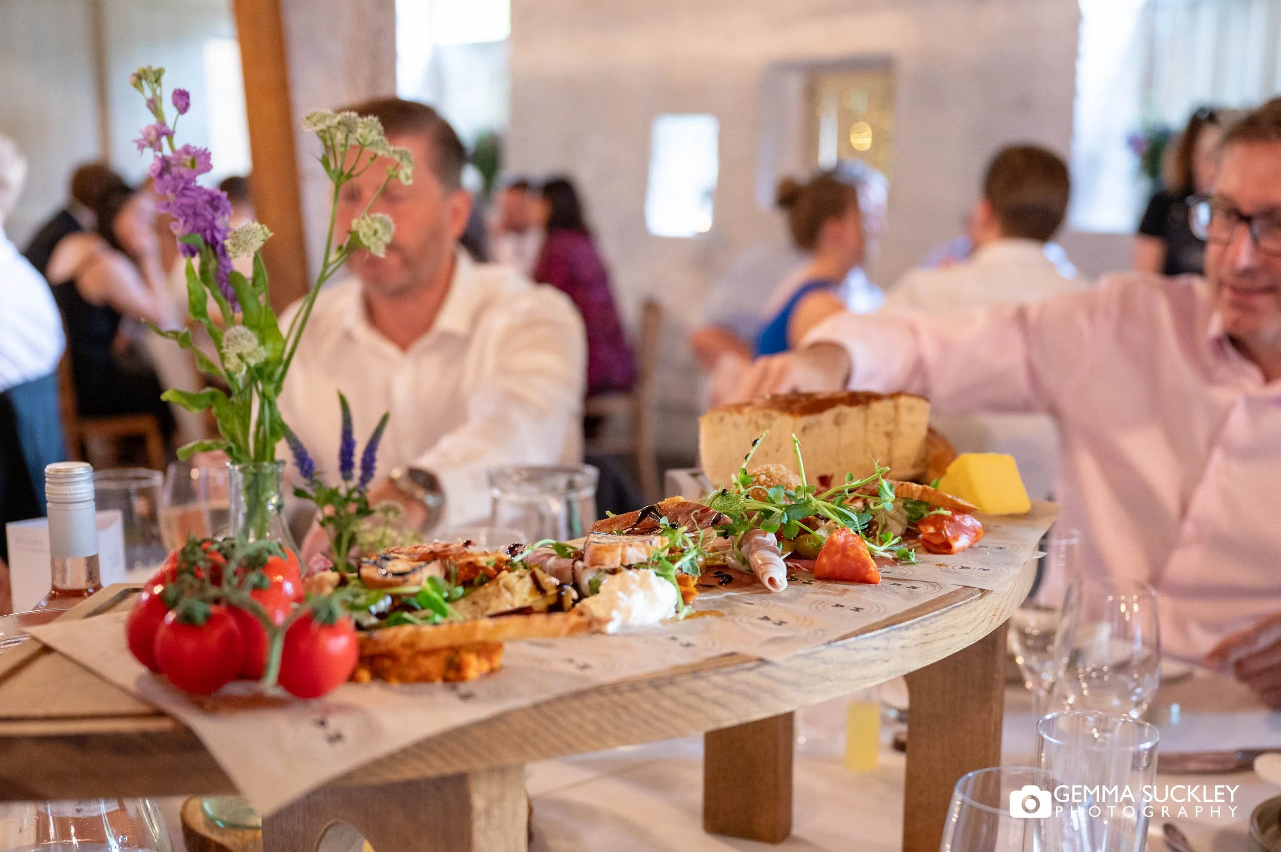 We wanted the whole day to feel more like a party than a formal day with our closest family and friends, and we really wanted to focus on the food. We chose sharing platters for our whole wedding breakfast with Hog & Apple, which went down a storm. I wanted to ensure that I had all of my favourite flowers and had chosen individual stems from the Flower Shop in Keighley rather than more formal bouquet /centrepieces. We were members of Craft Gin Club and had quite a selection of beautiful bottles which became part of the centrepiece vases (and the work to collect more bottles over the year wasn’t exactly taxing!!)